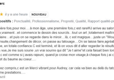 Je suis arrivee chez Audrey Rojo avec une petite appréhension. Et je me suis retrouvée face à une personne drôle, cultivée, attentionnée et très à l’écoute. Son sérieux et son professionnalisme m’ont tout de suite rassurée. Le temps est très vite passé grâce à la conversation et l’écoute d’Audrey. Biensur le tatouage n’est pas anodin et par moment « ça pique un peu » mais cela reste vraiment supportable.