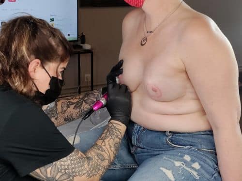 Suite à une mastectomie, retrouvez l’aspect réaliste d’un mamelon grâce à un tatouage en trompe-l’œil, imitant un téton.